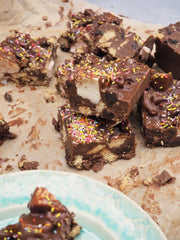 If you want to make this vegan, use a vegan butter (we like vitalite and BLOCK if you're not allergic to nuts) use vegan chocolates and marshmallows too - check the sprinkles, lots of sprinkles aren't vegan....