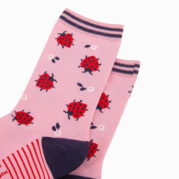 🧦 THIS PIECE Designed in the UK, these red ladybird socks are crafted from naturally breathable bamboo. Showcasing cute red ladybirds on a light pink sock with a contrasting navy heel and toe.