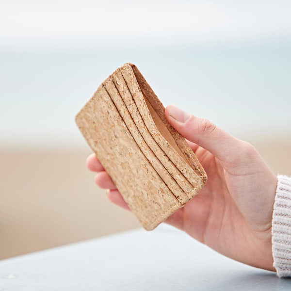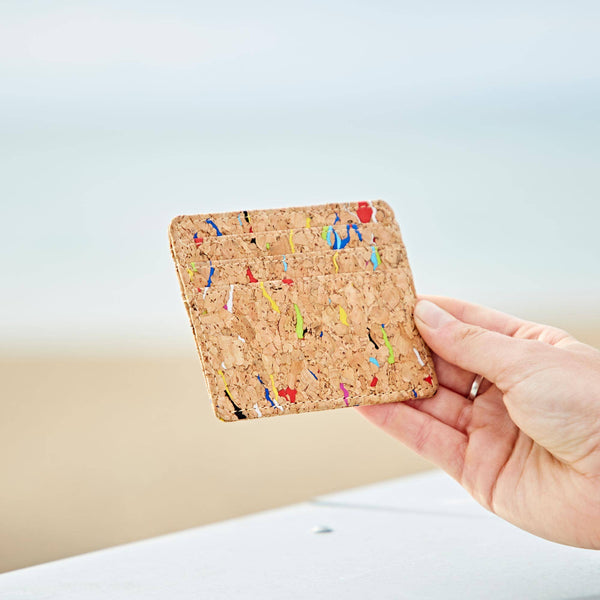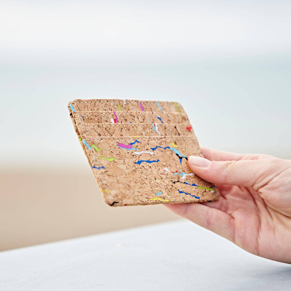 Hand crafted from hard-wearing, waterproof natural cork, this lightweight and slim credit card holder is soft to the touch and will hold all your essential bank and membership cards. Our multicoloured version features pieces of incorporated recycled rubber to add a bit of colour to your accessory. A great vegan-friendly alternative to our leather card holders, it makes the perfect sustainable Christmas gift. Size approx. 10.5 × 8.5 cm This card holder features 6 card slots and a middle section for cards, notes or receipts. We offer a plain and multicoloured version featuring recycled rubber. Every one of our Paper High accessories is delivered to you in a complimentary gift box. Please note that each product is unique and possesses distinct traits. Due to the handmade nature of these products there may be some minor imperfections such as scratches and blemishes.